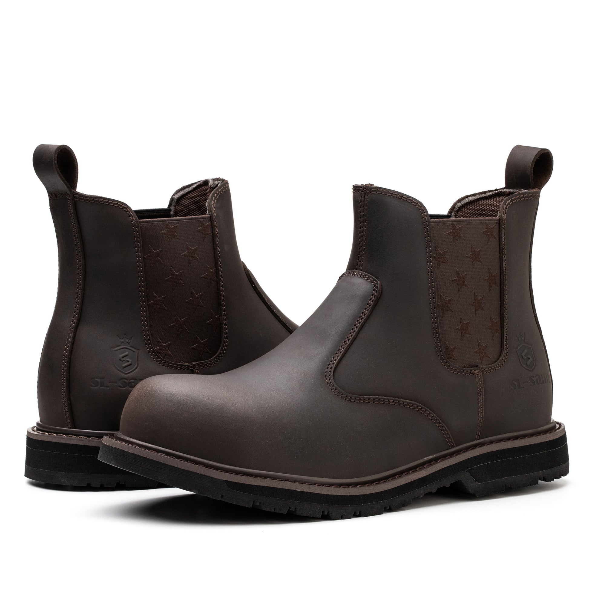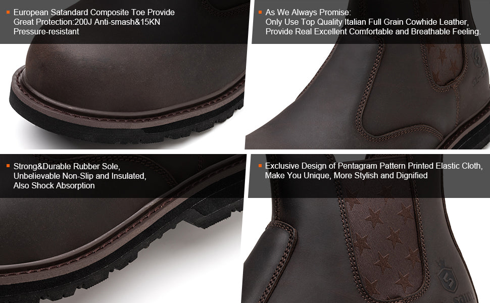 - 🤞【Comfortable&Breathable】SL-CH002 Exclusive Original Design pull on chelsea safety boots made by italian top grade full grain crazy horse cowhide,water resistant leather,excellent comfortable,breathable and the leather also water resistant,to keep your feet warm and dry,and not tired after one day’s hard work.A journey of a thousand miles begins with the first step, and comfort is the first attribute of work boots,That's why you can't say no to SL-CH002.