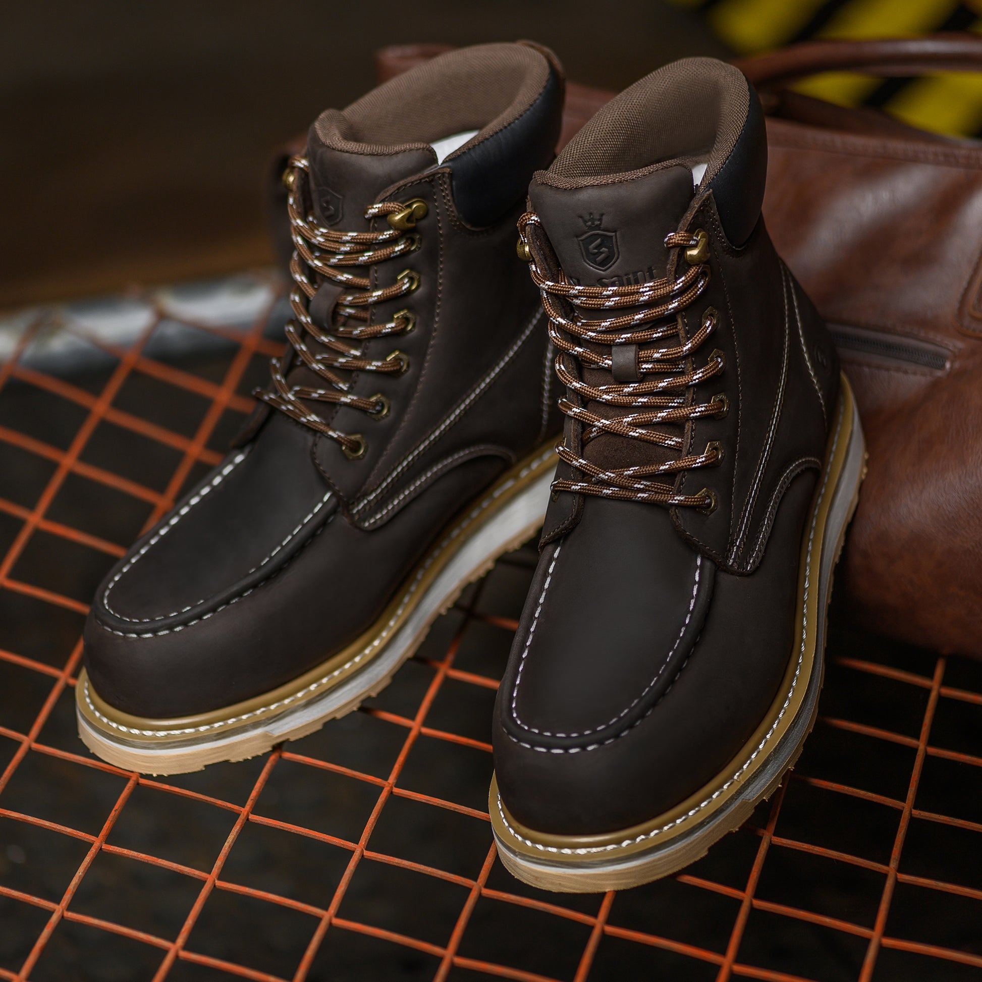 - ✔【Comfortable&Durable】As with all boots, comfort is the most important feature besides safety, that Exclusive Original Design moc toe work boots are made of top quality Italian first layer oil tanned cowhide leather, genuine handmade goodyear welts and new compound rubber soles, making it perhaps the most comfortable and durable premium safety boots you have ever worn. The most comfortable and durable premium safety boots you've ever worn. Wear it once and you'll fall in love with it!