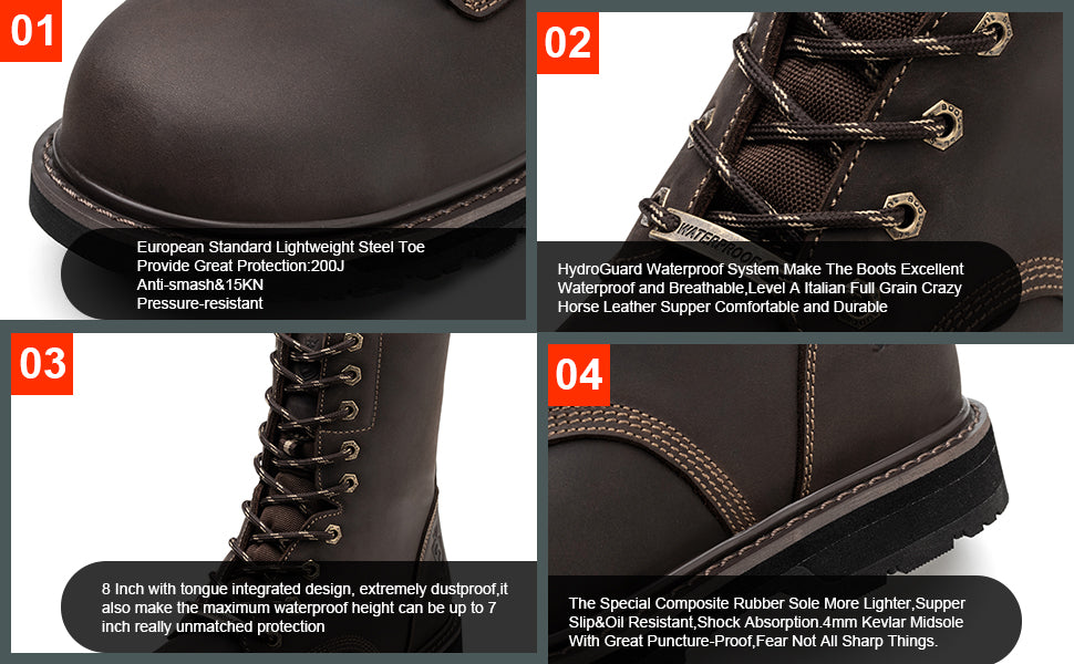 - ⚡️【Protection&Safety】There is no doubt that the most important quality of safety boots is protection. That 8 Inch waterproof work boots adopts the highest quality Steel Toe, to provide you with super anti-impact ability,4mm European standard Kevlar is also used,to make it puncture-proof,Let you do not fear any hidden sharp objects under your feet.Unquestionably approved by ASTM F2413-11 M I/75 C/75 EH certification.